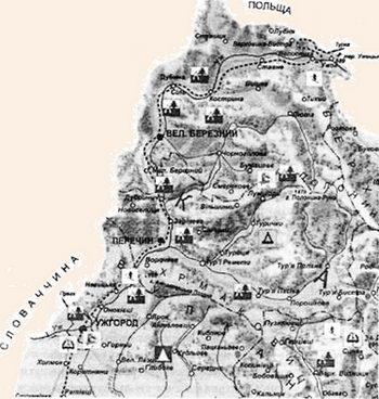 Рис. 3.5. Використання спеціальних туристичних умовних знаків (значків, лінійних знаків і якісного фону) на туристичній карті Закарпатської області (фрагмент)
