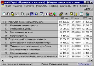Реализованная в Audit Expert «Матрица финансовых стратегий» позволяет на основе данных бухгалтерской отчетности выявить динамику изменения результатов финансовой и хозяйственной деятельности предприятия и получить заключение с анализом возможных вариантов дальнейшего развития финансово-хозяйственного состояния компании.