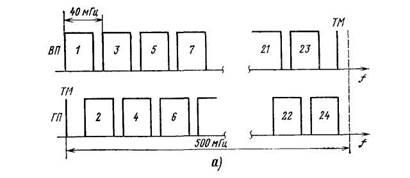 выполняют так, чтобы получить максимальную пропускную способность. В полосе 500 МГц, отводимой на один ИСЗ, можно разместить спектры сигналов 12 стволов. Обычно полоса ствола –36 МГц, а ЗЧИ между стволами – 4 МГц. Чтобы увеличить вдвое емкость ретрансляторов, вдвое уменьшают разнос между несущими соседних стволов, а необходимую развязку между перекрывающимися по спектру сигналами получают за счет поляризации. Для всех нечетных стволов (рис 5,а) берут, например, вертикальную поляризацию (ВП), а для четных – горизонтальную (ГП). Напомним, что применение линейной поляризации возможно в ИСЗ с жесткой стабилизацией на орбите. В той же полосе частот передают сигналы телеметрии (ТМ). Ретранслятор (рис. 5,6) имеет шесть антенн, причем WA1, WA2 и WA6 работают с волнами вертикальной поляризации, WA3, WA4 и WA5 – горизонтальной, где антенны WA1, WA3, WA5, WA6 –глобальные; WA2, WA4 –узконаправленные. Устройства совмещения (УС) служат для разделения волн приема и передачи. Итак, на ПФ Z1 приходят сигналы нечетных стволов. Оттуда они поступают в приемник Пр1, а затем через разветвитель A3 в передающие комплекты Ш и П2 и в антенны. Сигналы четных стволов проходят через ПФ Z2, приемник Пр2, передающие комплекты ПЗ и П4 и поступают в антенны. Минимальный частотный разнос между сигналами передатчиков, подключенных к одной антенне, составляет 80 МГц. Приемник содержит МШУ А1, смеситель UZ, ГТ и УСВЧ А2. В ретрансляторе применено однократное преобразование частоты. Переключатели К1