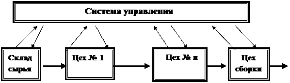 предполагает наличие комбинированной транспортно-складской системы, которая объединяет определенное количество рабочих мест, бригад, участков путем установления связи каждого рабочего места с любым другим посредством информационного и материального потоков. Организация движения материального потока проходит по схеме: поиск материала, необходимой заготовки или детали на складе – транспортировка к станку – обработка – возвращение обработанной по данной операции детали на склад.