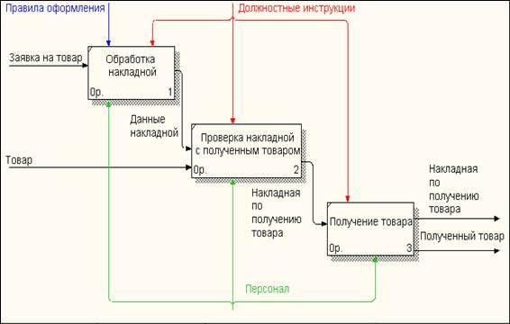 . Для изучения бизнес-процессов «Формирование заказа поставщика», «Получение товара», «Отпуск товара», рассмотрим диаграммы которые представлены в виде IDEF0 диаграмме. IDEF0 система представляется как совокупность взаимодействующих работ или функций.
