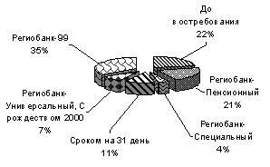 Наибольший удельный вес в общем количестве рублевых вкладов на 1.01.2001 г. имеют «Региобанк-Пенсионный» – 45 %; «Региобанк- Специальный» - 25 %; до востребования – 22 %. Вклады в долларах США: сроком на 1 год – 41 %; на 181 день – 40%. Все действующие виды вкладов в рублях и иностранной валюте приведены в Приложении 1, 2, 3.
