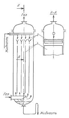 а) Поверхностные абсорберы, в которых поверхностью контакта между фазами является зеркало жидкости (собственно поверхностные абсорберы) или поверхность текущей пленки жидкости (пленочные абсорберы) (рис. 1). К этой же группе относятся насадочные абсорберы, в которых жидкость стекает по поверхности загруженной в абсорбер насадки из тел различной формы (кольца., кусковой материал и т. д.), и механические пленочные абсорберы. Для поверхностных абсорберов поверхность контакта в известной степени определяется геометрической поверхностью элементов абсорбера (например, насадки), хотя во многих случаях и не равна ей.