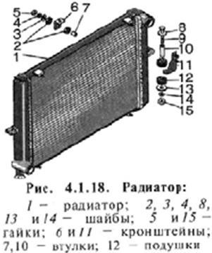 Радиатор 13 (см. рис. 1) предназначен для охлаждения горячей воды, выходящей из рубашки охлаждения двигателя. Располагается он впереди двигателя. Трубчатый радиатор состоит из верхнего и нижнего бачков, соединенных между собой тремя-четырьмя рядами латунных трубок. Поперечно расположенные горизонтальные пластины придают радиатору жесткость и увеличивают поверхность охлаждения.