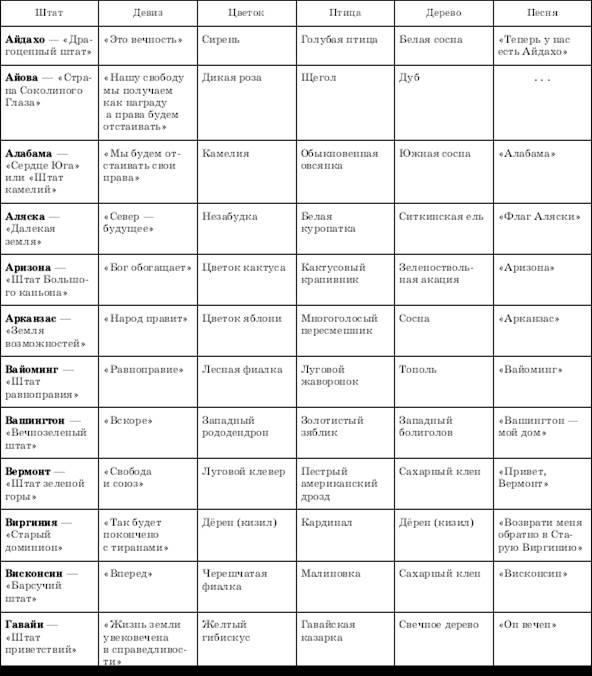 Это Айдахо, Айова, Алабама, Аризона, Арканзас, Вайоминг, Висконсин, Северная и Южная Дакота, Иллинойс, Индиана, Канзас, Кентукки, Массачусетс, Миннесота, Миссисипи, Миссури, Мичиган, Небраска, Огайо, Оклахома, Теннесси, Техас, Юта. Добавим сюда и Аляску, название которой имеет алеутские корни, а также Гавайи.