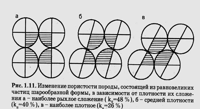 Пористость однородных, хорошо отсортированных пород выше чем неоднородных, т.к. в неоднородных породах более мелкие частицы располагаются среди более крупных и общая плотность упаковки повышается. Существенное влияние на пористость пород оказывает плотность сложения. На рис 1.11 видно, что в зависимости от плотности укладки равновеликих частиц шарообразной формы, независимо от их размера, коэффициент пористости может изменяться от 26 % при тетраэдрической укладке частиц, до 48 % при кубической.