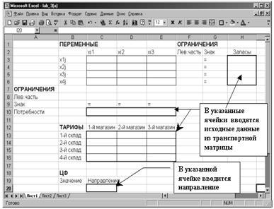 из нескольких пунктов отправления в пункты назначения. При этом величина транспортных расходов прямо пропорциональна объему перевозимой продукции и задается с помощью тарифов на перевозку единицы продукции