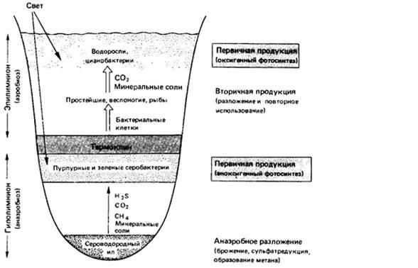 В стратифицированном озере имеются два типа водной среды, в которых идет первичное образование биомассы за счет фотосинтеза: в слоях, близких к поверхности эпилимниона, происходит оксигенный фотосинтез, а в верхнем слое гиполимниона - аноксигенный фотосинтез.