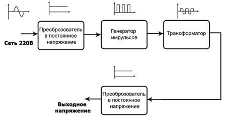 Розглянемо блок-схему простого імпульсного блоку живлення, що лежить в основі всіх імпульсних блоків живлення.