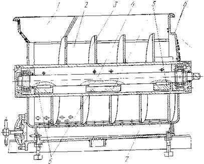 1 – загрузочный бункер; 2 – рабочая камера; 3 – шнек; 4 – приводной вал; 5 – грузы – дебалансы; 6 – короб; 7 сборник