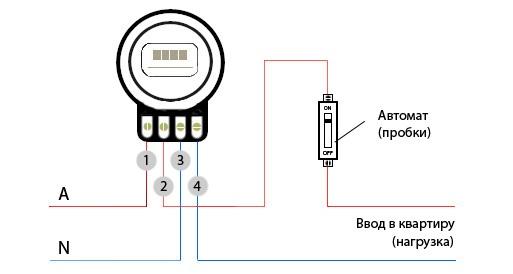 Однофазные электросчётчики имеют четыре контакта в клеммной колодке. Схемы подключения однофазных электросчётчиков типовые, независимо от типа счётчика. На клемму 1 подаётся питание - фаза, клемма 2 – его выход на нагрузку;