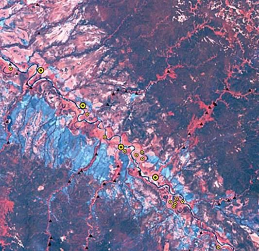 | Рис. 7. Участки вторичных лиственных лесов (красный цвет) и лишайниковые сосняки по гарям (голубой цвет), приуроченные к населенным пунктам и охотничьим избам. Республика Коми, Удорский район, долина реки Вашка. Космический снимок (Landsat ETM+). |