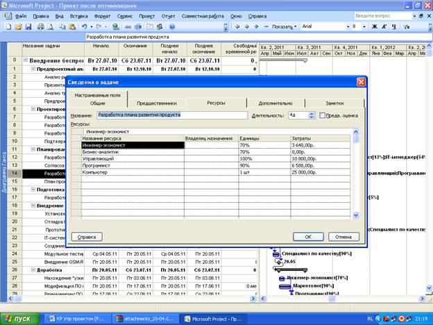 Назначение в диаграмме Гантта щелкнуть на свойства и перейти во вкладку «ресурсы».