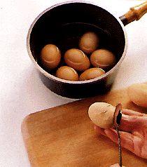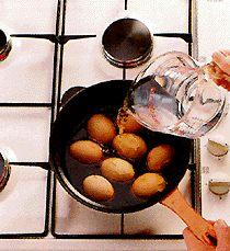 Затем положите яйца в один слой и, доведя до кипения, варите на медленном огне в течение 30 минут. Выключите огонь и оставьте яйца для охлаждения в той же смеси. Перед подачей на стол очистите яйца от скорлупы.