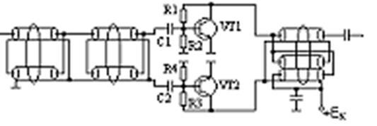 После предварительного усиления сигнал через разделительный конденсатор поступает на оконечнй каскад (ОК) и подводится мощность к базам транзисторов. Сигнал подаётся на модуль усилителя, выполненного по двухтактной схеме. Каскад выполнен на транзисторах VT1- VT2, резисторах R1-R4 и разделительных конденсаторах С1- С2. Сопротивлениями R1-R4 создаётся постоянное смещение на базах транзисторов. Далее следуют . Транзисторные каскады питаются напряжением, подведенным к коллекторам транзисторов через симметрирующие линии, выполняющие также функцию подавления четных гармоник. Конденсатор С3 является блокировочным по питанию.
