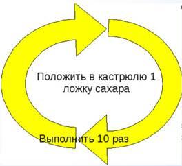 Достаточно часто необходимо не только выполнить какую-либо последовательность действий, но и повторить ее определенное число раз. Например, если мы составляем алгоритм приготовления какого-либо блюда, где есть операция «положить в кастрюлю 10 ложек сахара», то мы можем столкнуться с тем, что нам необходимо выполнить операцию «положить в кастрюлю 1 ложку сахара» 10 раз подряд, т.е. наш алгоритм будет выглядеть следующим образом: