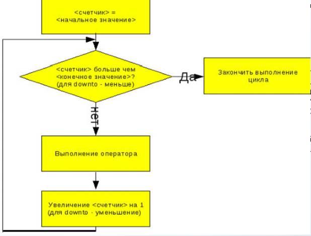 Данный цикл исполняется до тех пор, пока переменная — счетчик цикла не выходит за заданные пределы.[4,c.40] При этом на каждой итерации цикла счетчик увеличивается на 1 (to) или уменьшается на 1 (downto). При этом возможно использование значения счетчика, например, для расчетов внутри цикла. За пределами цикла сохранение последнего значения счетчиком цикла не гарантируется.