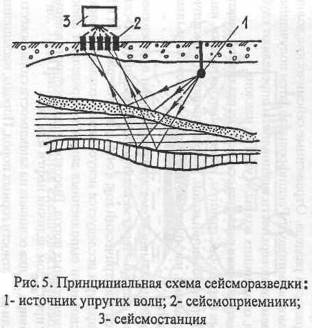 Сейсмическая разведка (рис.5) основана на использовании закономерностей распространения в земной коре искусственно создаваемых упругих волн. Волны создаются одним из следующих способов: 1) взрывом специальных зарядов в скважинах глубиной до 30 м; 2) вибраторами; 3) преобразователями взрывной энергии в механическую. Скорость распространения сейсмических волн в породах различной плотности неодинакова: чем плотнее порода, тем быстрее проникают сквозь нее волны. На границе раздела двух сред с различной плотностью упругие колебания частично отражаются, возвращаясь к поверхности земли, а частично преломившись, продолжают свое движение вглубь недр до новой поверхности раздела. Отраженные сейсмические волны улавливаются сейсмоприемниками. Расшифровывая затем полученные графики колебаний земной поверхности, специалисты определяют глубину залегания пород, отразивших волны, и угол их наклона.