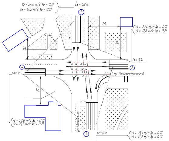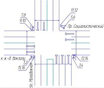 На рисунке 9 показаны число и номера конфликтных точек для первого подхода перекрестка.