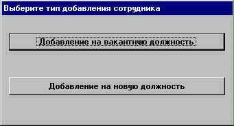 Если нажать кнопку "Добавление на новую должность", то программа перейдёт в режим добавления данных о новом сотруднике (с помощью этого же пункта меню можно создать новую вакантную должность, внеся в базу только наименование должности, подразделение и оклад). Если нажать кнопку "Добавление на вакантную должность", то появится окно со списками отделов, вакантных должностей этого отдела и окладов данной вакантной должности. После выбора всех этих значений пользователь может приступить к вводу информации в базу.