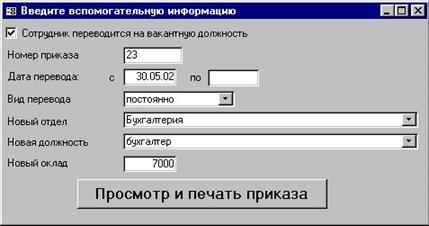После того, как вы сделаете свой выбор, появится окно (рис. 4.19), в которое необходимо ввести вспомогательную информацию, необходимую для оформления перевода (обратите внимание, что если сотрудник переводится на имеющуюся вакантную должность, то необходимо установить соответствующий выключатель в окне ввода вспомогательной информации):