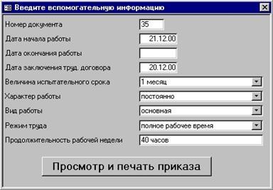 После того, как в базу данных внесена информация о новом сотруднике, возникает необходимость распечатать на принтере приказ о приёме на работу этого сотрудника. Для этого служит кнопка "приём (Т-1)". После нажатия этой кнопки появится следующее окно (рис. 4.20), в которое пользователь программы должен внести некоторую вспомогательную информацию: