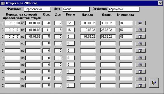 Появится окно, в которое можно ввести информацию об отпусках сотрудника за заданный год и распечатать приказ о предоставлении отпуска. Информация обо всех отпусках сохраняется в базе данных до момента удаления сотрудника из базы и может быть просмотрена в любое время.