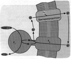Бактериородопсин — светозависимый протонный насос. Он способен активно откачивать ионы Н+