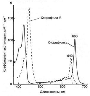 молекула хлорофилла состоит из порфиринового ядра, образованного тетрапиррольным кольцом с расположенным в центре атомом магния, и фитольного хвоста. Хлорофилл относится к классу веществ, называемых пигментами, то есть сильноокрашенных соединений, характеризующихся интенсивным поглощением видимого света. Было установлено, что система "легко возбудимых" сопряженных связей порфиринового кольца обусловливает высокую способность хлорофилла к поглощению света (рис. 36). Так, миллиметровый слой 1 мМ раствора хлорофилла поглощает около 90% падающего на него красного или синего света (зеленый свет поглощается менее эффективно, что и определяет зеленый цвет растений). Для хлорофилла, как и для других пигментов, характерно относительно длительное время, около 1(Г8