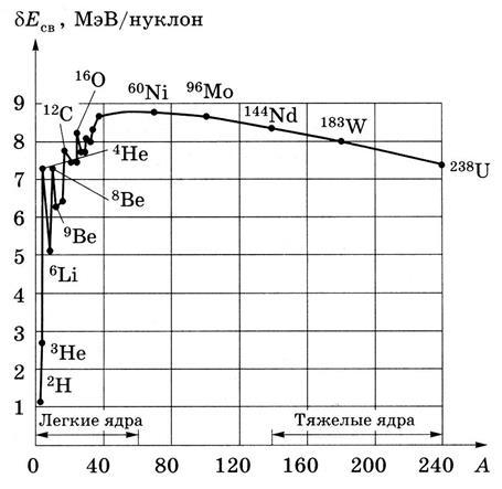 Сильнее всего связаны нуклоны в ядрах с массовыми числами порядка 50–60 (от Cr до Zn). Для них МэВ/нуклон. С ростом A