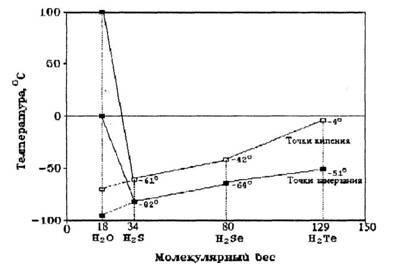 Te, то есть соединения водорода и серы, водорода и селена, водорода и теллура и так далее, при комнатной температуре находятся в газообразном состоянии. Казалось бы, вода, сохрани она такие же свойства, должна бы закипать при температуре -70°С, а превращаться в лед при -90 °С. Эти условия вряд ли бы способствовали развитию жизни на Земле, ведь она должна была бы существовать в интервале температур от -70 °С до -90 °С (рис.3). В таком холоде разве возможна жизнь?
