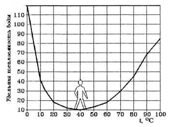 Как видно из рис.4, теплоемкость воды своих минимальных значений достигает около +37 °С. Это нормальная температура тела человека. Именно при температуре 36,6-37оС сложнейшие реакции обмена веществ в организме человека наиболее интенсивны. Значит, при этой температуре организм человека находится в наивыгоднейшем энергетическом состоянии.