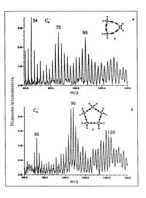 як в абсолютному сенсі, так і в порівнянні з вищими фулеренами. Будь-яка модель повинна так або інакше пояснювати цей факт. Відправною крапкою у пошуках пояснення звичайно служить масс-спектр, одержаний в 1984 р. в експериментах лазерного випаровування графіту, який містить відносно легкі кластери Сn