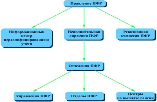 Руководство Пенсионного фонда России осуществляет Правление и его постоянно действующий орган - Исполнительная дирекция. Дирекции подчиняются отделения в республиках в составе РФ, отделения в национально - государственных и административно-территориальных образованиях. На местах (в городах, районах) имеются уполномоченные Фонда. Отделения обеспечивают организационную работу по сбору взносов на социальное страхование, финансирование органов социального обеспечения, региональных программ социального обеспечения, а также контроль за расходованием средств.