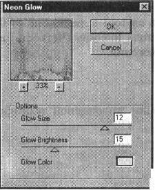 Значение поля Glow Size (Область) в диапазоне от —24 до +24 определяет величину области неонового цвета в зависимости от тонового уровня. В поле Glow Brightness (Яркость) в диапазоне от 0 до 50 устанавливают уровень «свечения» неонового цвета, который выбирается в поле Glow Color (Цвет). Щелчок на цветном поле выводит на экран диалоговое окно Color (Цвет).