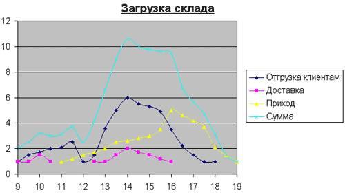 В тоже время, если посмотреть на график загрузки склада (см. рис.3), то станет очевидным крайняя неравномерность нагрузки. Это является с одной стороны следствием отсутствия регламента процессов в течение рабочего дня, а с другой стороны отсутствием напрашивающейся связи между складскими процессами и процессами поставок и продажи (или, другими словами, между подразделениями склада, поставок и сбыта).