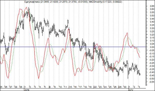 На рисунке 1 представлены графики курса акций Сургутнефтегаз, индикатора MACD и сигнальной линии. Красной линией отмечен сам индикатор MACD, зеленой – сигнальная линия, а синей прямой – нулевая линия.
