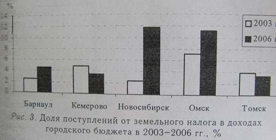Проведенный анализ местных бюджетов показал, что в последние годы доля поступлений от аренды в доходах городских бюджетов имеет тенденцию к росту: так рост за 2003-2006 годы составил в среднем 1,5 раза, если исключить Новосибирск. Данный вид бюджетных доходов увеличился не столь высокими темпами, как земельный налог.