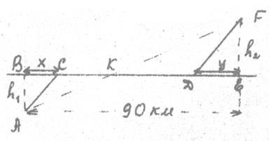 Определить оптимальный по времени маршрут выдвижения танкового подразделения из пункта А в пункт F, если допустимая скорость движения танков до дороги , по дороге , за дорогой . Удаление от дороге пункта А равно , пункта F . Расстояние между точками В и Е равно L = 90 км