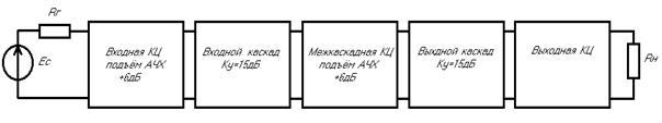 Расчёт усилителя будем проводить исходя из того, что искажения распределены следующим образом: выходная КЦ–1 дБ, выходной каскад с межкаскадной КЦ–1.5 дБ, входной каскад со входной КЦ–0.5 дБ. Таким образом, максимальная неравномерность АЧХ усилителя не превысит 3 дБ.