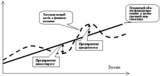 Потребность в краткосрочном финансировании может быть представлена как отрицательная разница между объёмом располагаемого долгосрочного финансирования и нарастающей потребностью предприятия в оборотном капитале. Постоянная минимальная потребность в оборотных средствах финансируется за счёт собственного капитала, а сезонная и другие дополнительные потребности за счёт заёмных, кредитных источников.