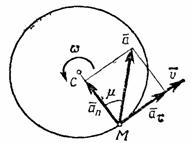 Касательная составляющая ускорения направлена по касательной к траектории (в сторону движения при ускоренном вращении тела и в обратную сторону при, замедленном); нормальная составляющая всегда направлена по радиусу МС к оси вращения (рис. 12). Полное ускорение точки М будет или .