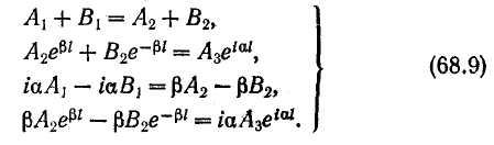 Прохождение через барьер. Пусть частица, движущаяся слева направо, падает на потенциальный барьер  высоты Uo и ширины l (рис. 3). По классическим представлениям поведение частицы имеет следующий характер. Если энергия частицы больше высоты барьера (E>U0), частица беспрепятственно проходит «над» барьером (на участке 0 x l лишь уменьшает скорость частицы, но затем при х > I снова принимает первоначальное значение). Если же Е меньше Uo (как изображено на рисунке), то частица отражается от барьера и летит в обратную сторону; сквозь барьер частица проникнуть не может. Совершенно иначе выглядит поведение частицы согласно квантовой механике. Во-первых, даже при Е>U0 имеется отличная от нуля вероятность того, что частица отразится от барьера и полетит в обратную сторону. Во-вторых, при Е < Uo имеется отличная от нуля вероятность того, что частица проникнет «сквозь» барьер и окажется в области, где х>l. Такое, совершенно невозможное с классической точки зрения, поведение микрочастицы вытекает непосредственно из уравнения Шредингера. Рассмотрим случай Е<Uo. В этом случае уравнение Шредингера имеет вид: , для областей I и III и для области , причем Е — U0<0. Легко убедиться (хотя бы подстановкой), что общее решение уравнения Шредингера для каждой из трех областей имеет вид: (7) причем и определяются из выражений: (8) Заметим, что решение вида eiax соответствует волне, распространяющейся в направлении оси х, а решение вида e-iax — волне, распространяющейся в противоположном направлении. Чтобы это понять, вспомним, что обычная (звуковая, электромагнитная и т. п.) плоская волна, распространяющаяся в направлении оси х, имеет вид cos(at—kx), а волна, распространяющаяся в направлении убывания х,— вид cos ( - kx) [см. т. I, формулы (78.2) и (78.5)]. В § 65 мы установили, что волновая функция свободной частицы, движущейся в направлении оси х, имеет вид (65.5). Если отбросить в этой формуле временной множитель, то для получится значение . Для частицы, движущейся в противоположном направлении, нужно, очевидно, взять e-i(p/h)x. В области III имеется только волна, прошедшая через барьер и распространяющаяся слева направо. Поэтому коэффициент В3 следует положить равным нулю. Для нахождения остальных коэффициентов воспользуемся условиями, которым должна удовлетворять функция . Для того чтобы была непрерывна во всей области изменений х от до , должны выполняться условия: = и 2(l) = (l). Для того, чтобы была гладкой, т. е. не имела изломов, должны выполняться условия: = и ’2(l) = ’(l) .Из этихусловий вытекают соотношения: (9) Разделим все уравнения на А1 и введем обозначения:  а также (10), Тогда уравнения (9) примут вид: (11) Отношение квадратов модулей амплитуд отраженной и падающей волны  определяет вероятность отражения частицы от потенциального барьера и может быть названо коэффициентом отражения. Отношение квадратов модулей прошедшей и падающей волны  определяет вероятность прохождения частицы через барьер и может быть названо коэффициентом прохождения (или коэффициентом прозрачности). Нас будет интересовать только прохождение частиц через барьер, и мы ограничимся нахождением величины D. Правда, найдя D, легко найти R, поскольку эти коэффициенты связаны очевидным соотношением: R+D=1. Умножим первое из уравнений (11) на i и сложим с третьим. В результате получим: 2i = (п + i) a2-(n- i) b2. (13) Теперь умножим второе из уравнений (11) на i и вычт