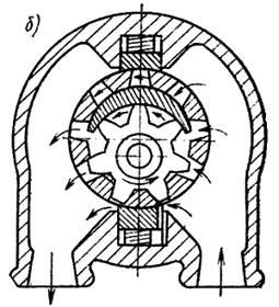 Они отличаются компактностью и малыми габаритами по сравнению с насосами внешнего зацепления. При той же подаче жидкость, заполняющая межзубовые впадины шестерен, переносится в полость нагнетания, где выдавливается через радиальные сверления в донышках впадин внешней (кольцевой) шестерни. Ведущей шестерней является шестерня с внутренними зубьями, связанная с приводным валом. Эта шестерня посажена на своей внешней поверхности в подшипник скольжения. Для отделения полостей всасывания и нагнетания в насосах, представленных на рисунках, применен серпообразный разделительный элемент с. При развороте этого элемента на 180° (рисунок б ) происходит реверсирование подачи (на рисунке направление движения жидкости указано стрелками).