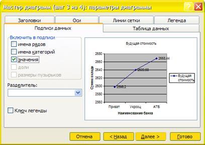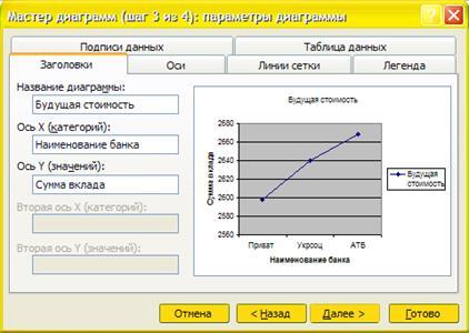- Окрываем вкладку "Ряд", имя ряда - кликаем на ячейку "Будущая стоимость", подписи оси ох - выделяем названия банков