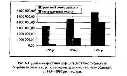 Співвідношення між обсягами дефіциту державного бюджету України та коштів, залучених за рахунок випуску облігацій, зображено на рис. 6.1. На рисунку показники за 1995 — 1996 роки відображають обсяги дефіциту державного бюджету, визначеного законодавством України, а обсяги залучення коштів представлені на рівні фактичного їх надходження до державного бюджету. За 1997 р. ці показники представлені відповідно до обсягів, визначених Законом України «Про державний бюджет на 1997 рік».