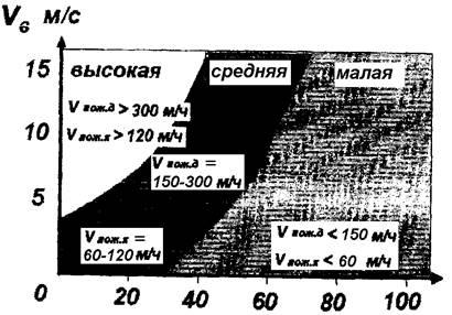 Скорость распространения пожара в зависимости от скорости ветра и влажности воздуха находятся по графику рис. 6.5. Из графиков видно, что при относительной влажности и скорости ветра :