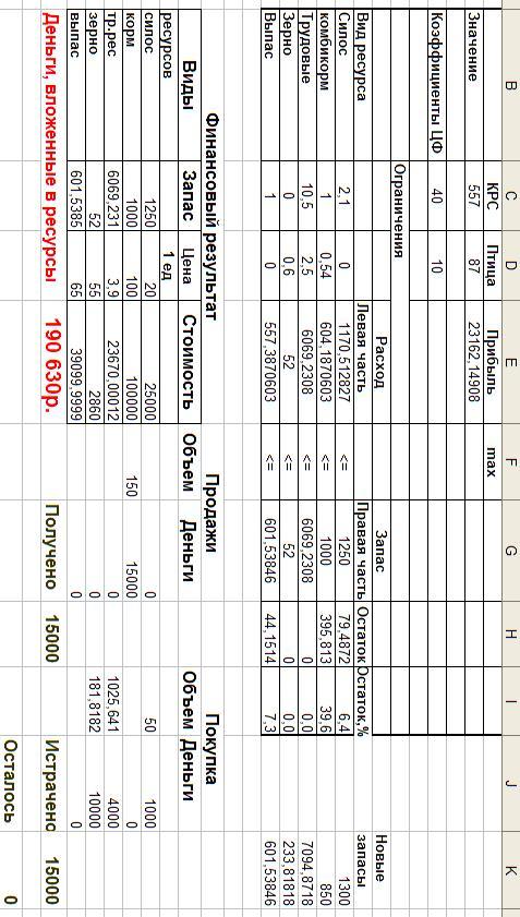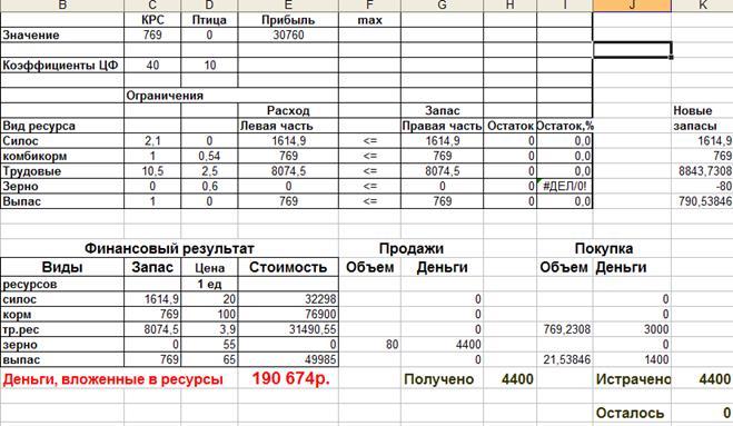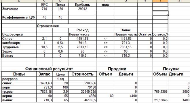 При решении задачи линейного программирования традиционным итерационным методом удалось добиться почти полного использования запасов ресурсов. Их остатки составили менее одного процента от запасов. В этом случае может быть произведено 600 голов КРС и 343 десятков индюков. При этом может быть получено 25713 у.е. прибыли.