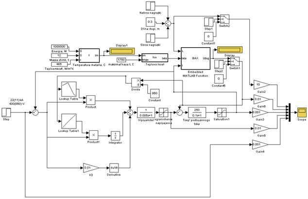 Блок-схема модели, составленная в терминах Simulink приведена на рис.4. Она позволяет в диалоговом режиме проводить проектирование регулятора тока дуговой печи постоянного тока с обобщенными или конкретными параметрами печи и источника питания.