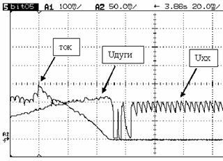 Рис. 5. Осциллограммы переходных функций тока и напряжения на дуге в режимах короткого замыкания и зажигания дуги